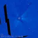 C3 images have a larger field of view: They encompass 32 diameters of the Sun. To put this in perspective, the diameter of the images is 45 million kilometers (about 30 million miles) at the distance of the Sun, or half of the diameter of the orbit of Mercury. Many bright stars can be seen behind the Sun.