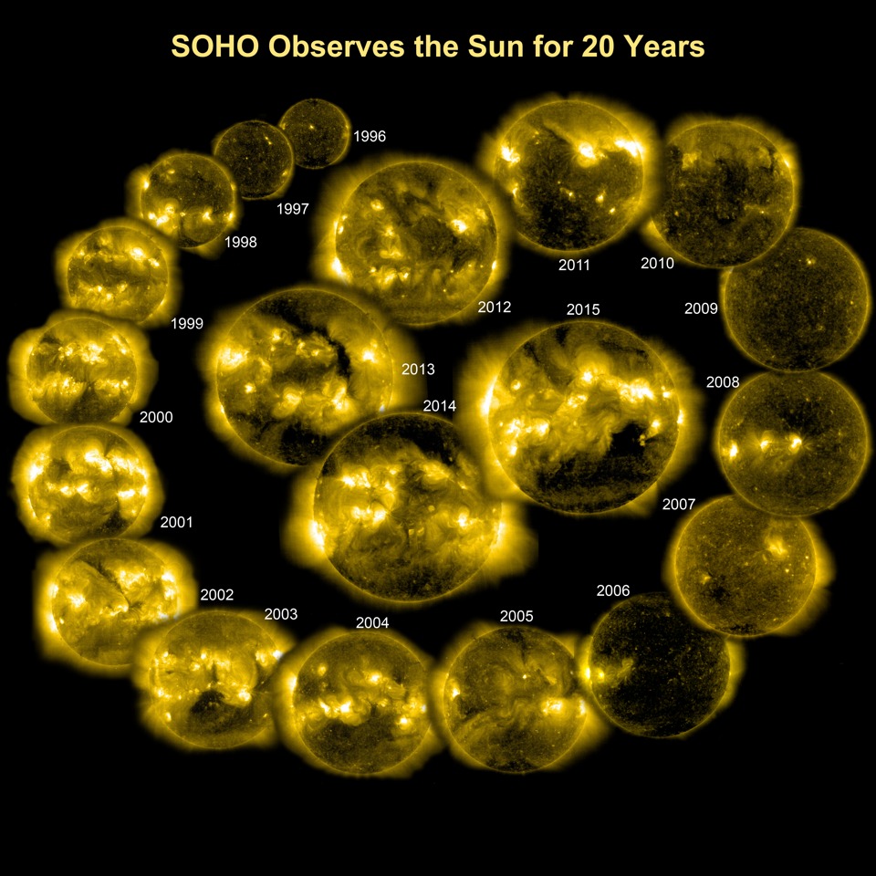 This collage of images taken in the 284 Angstrom wavelength of extreme ultraviolet light shows the Sun as it changed through almost two complete solar cycles. A solar activity cycle lasts 11 years on average. During a solar cycle the number of sunspots and level of solar activity dramatically rise and fall in a bell-shaped curve. The change is being driven by the gradual reversal of the Sun's magnetic field during that 11-year cycle. The brighter areas in the extreme ultraviolet correspond to areas of strong magnetic field. The remarkable record of long-term observations by SOHO has significantly advanced our understanding of the Sun's processes.