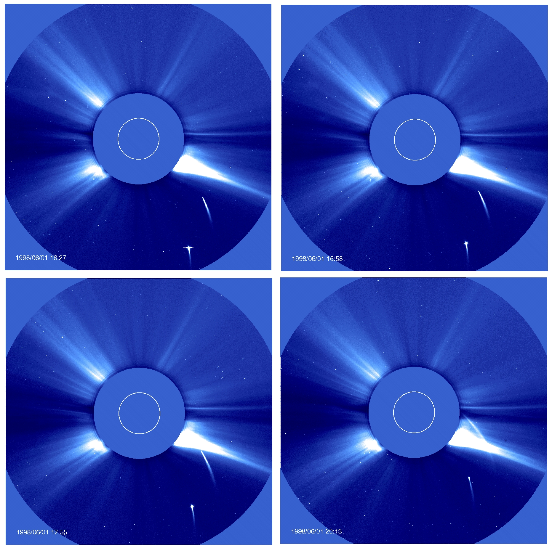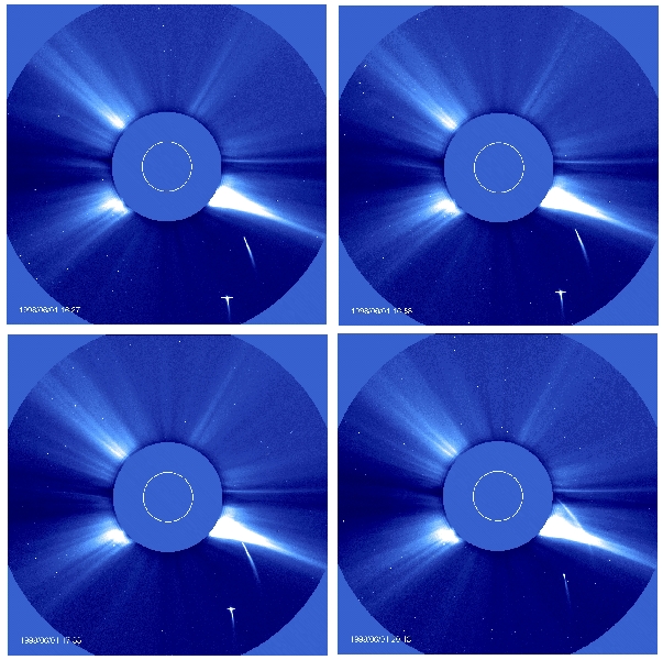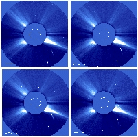 Series of LASCO C3 images showing two comets approaching the Sun. The time period covers about 4 hours. They do not reappear on the other side.