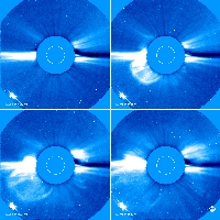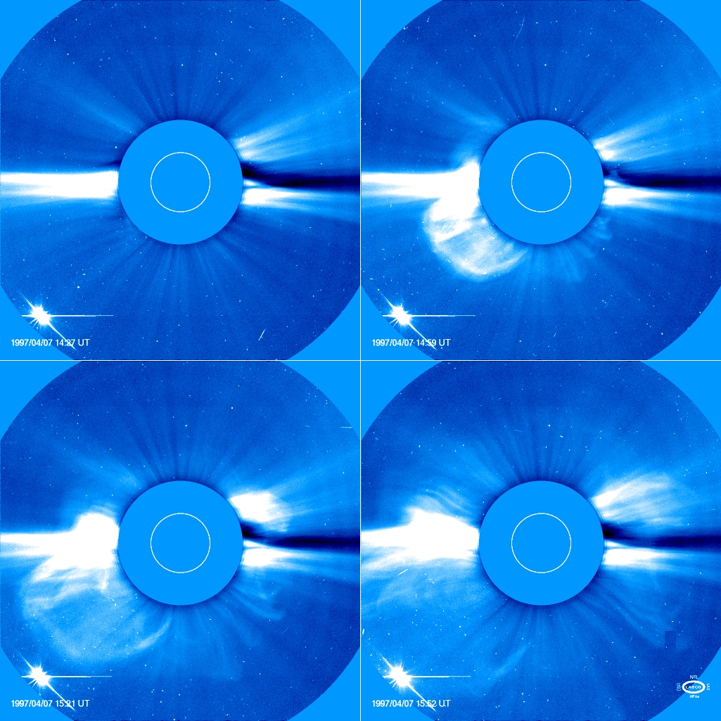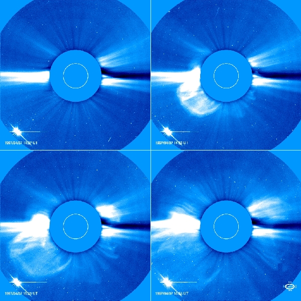 An image sequence over less than two hours of a coronal mass ejection 7 April 1997 taken by LASCO C2. In this sequence a CME blasts into space a billion tons of particles travelling millions of miles an hour.