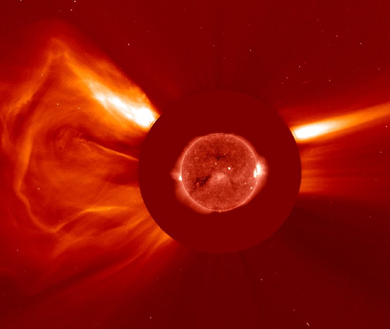 A bright and expansive coronal mass ejection (CME) unfurled itself over about an eight-hour period (January 24, 2006) this week. As seen in SOHO's LASCO C2 coronagraph, the bright front emerged in the shape of an arc from behind the occulting disk but soon expanded into a ragged, bulbous shape with lots of structural lines inside it. (The Sun is represented by the white circle in the center of the red occulting disk.) The source of this CME was apparently an active region just beginning to rotate into view the following day.