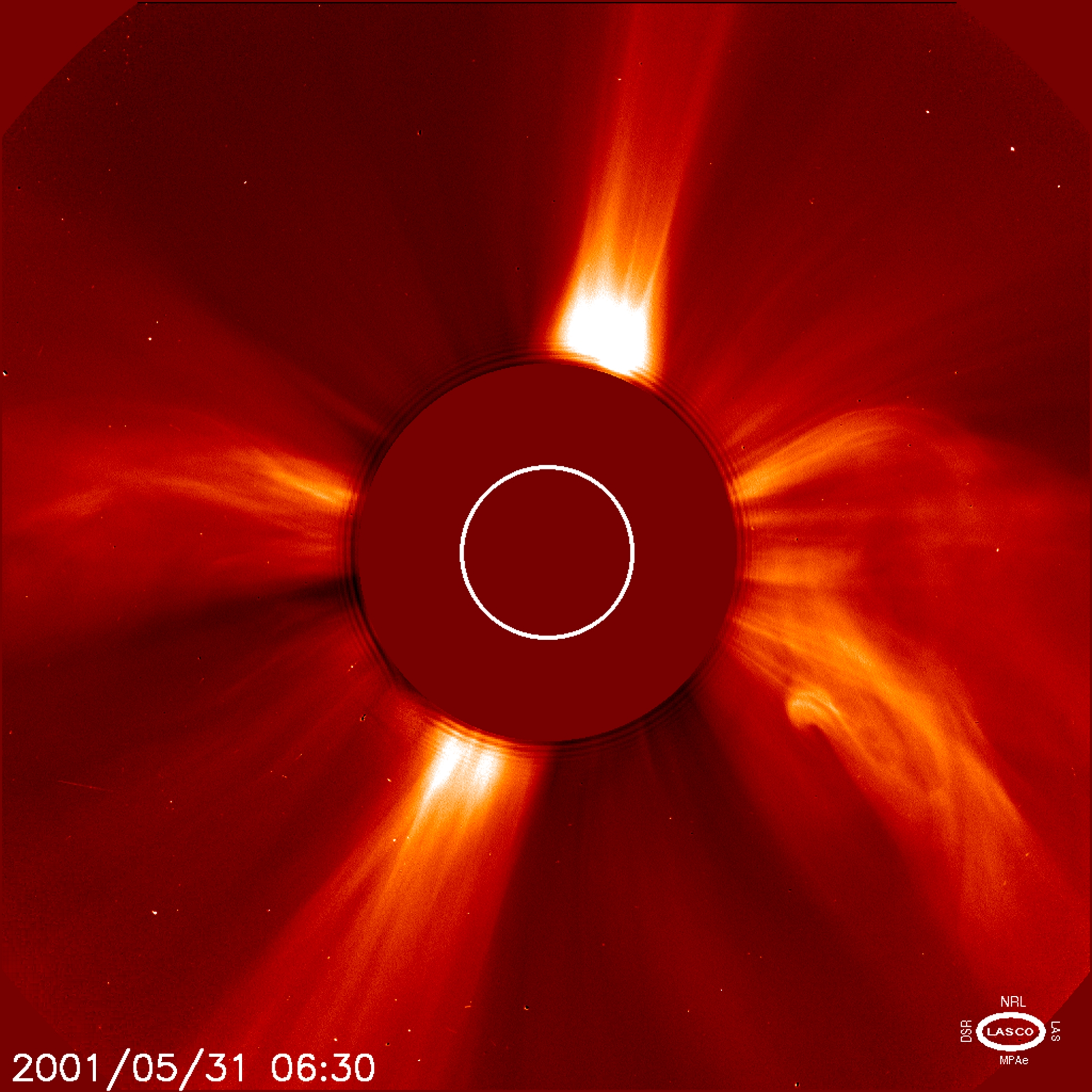 Image of two coronal mass ejections 31 May 2001 taken by LASCO C2. Nearly simultaneously, two CMEs blast into opposite directions from the Sun, a fairly uncommon observation. CMEs eject a billion tons of particles traveling millions of miles an hour. The dark disk blocks the Sun so that the LASCO instrument can observe the structures of the corona in visible light.