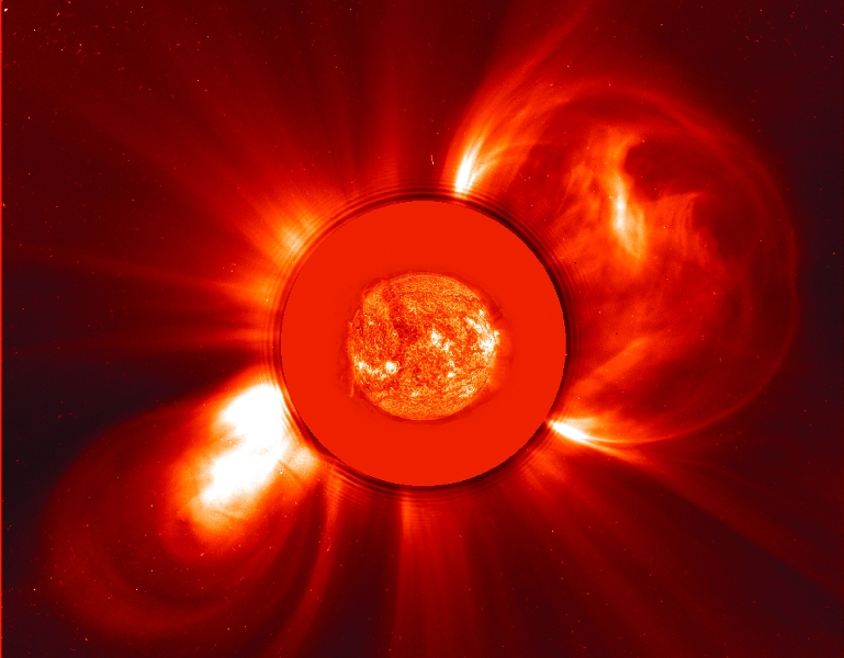 Double CME -- This LASCO C2 coronograph image from 8 November 2000 shows what appears to be two CMEs heading in symmetrically Double CME -- This LASCO C2 coronograph image from 8 November 2000 shows what appears to be two CMEs heading in symmetrically opposite directions from the Sun. An EIT 304Å image from the same day has been superimposed over the dark disk which blocks the Sun so that the LASCO instrument can observe the structures of the corona in visible light.