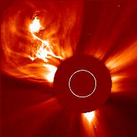 This fiery Coronal Mass Ejection (CME) shows stunning details in the ejected material. Taken by LASCO C2 on January 4, 2002. In coronagraph images, direct sunlight is blocked by an occulter, revealing the surrounding faint corona. The approximate size of the Sun is represented by the white circle.