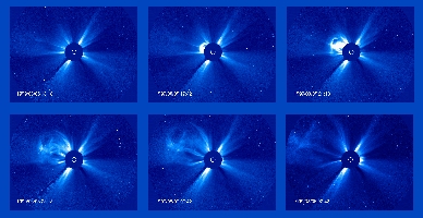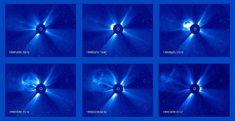 Progress of a Coronal Mass Ejection (CME) observed over an eight hour period on 5-6 August 1999 by LASCO C3. The dark disk blocks the Sun so that the LASCO instrument can observe the structures of the corona in visible light. The white circle represents the size and position of the Sun.