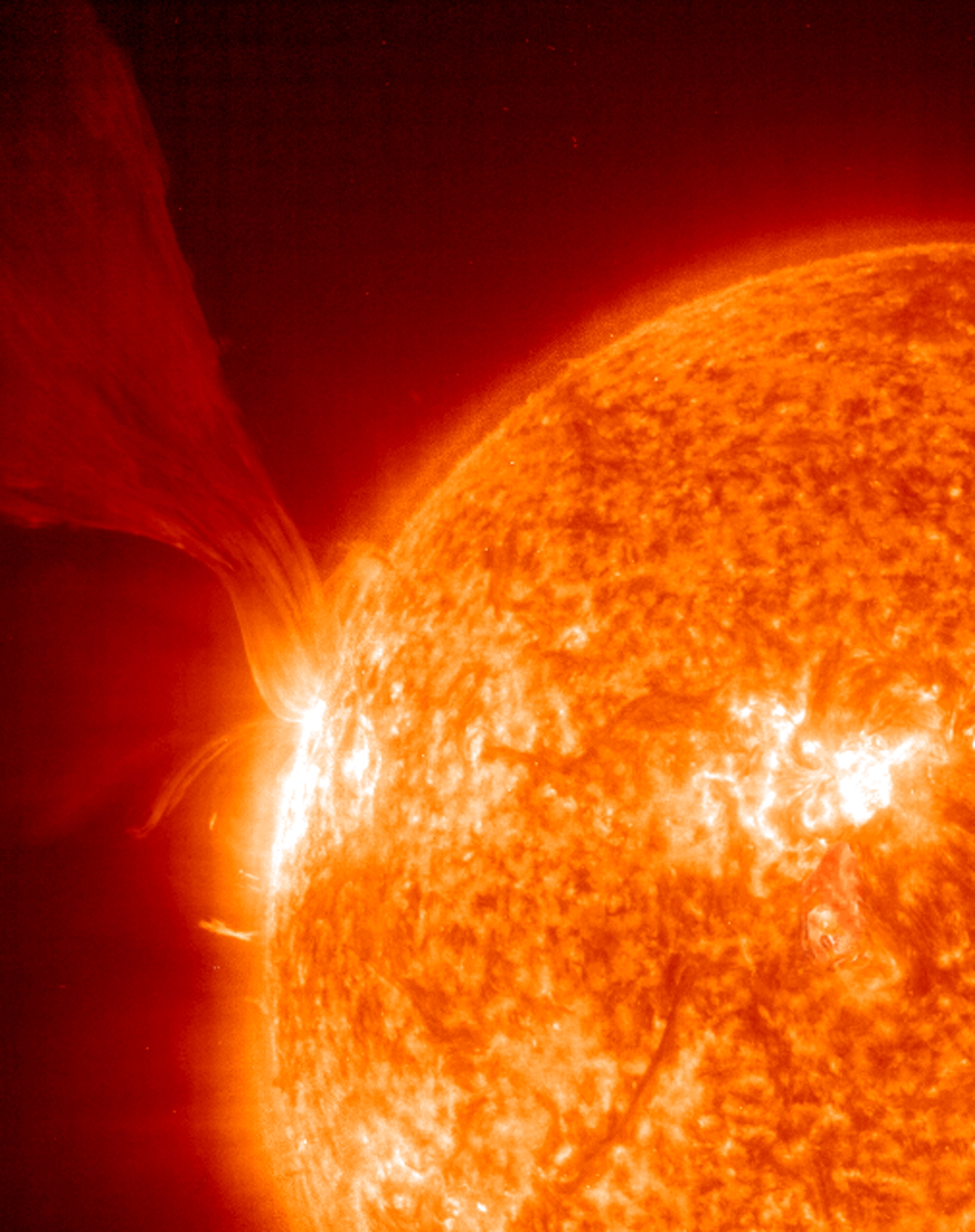 An extensive erupting prominence taken on 15 May, 2001 -- Prominences are huge clouds of relatively cool dense plasma suspended in the Sun's hot, thin corona. At times, they can erupt, escaping the Sun's atmosphere. Emission in this spectral line of EIT 304Å shows the upper chromosphere at a temperature of about 60,000 degrees K. The hottest areas appear almost white, while the darker red areas indicate cooler temperatures.