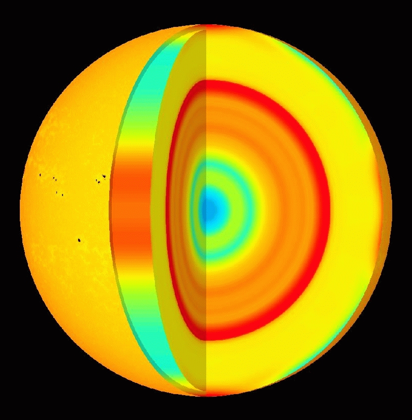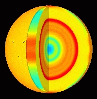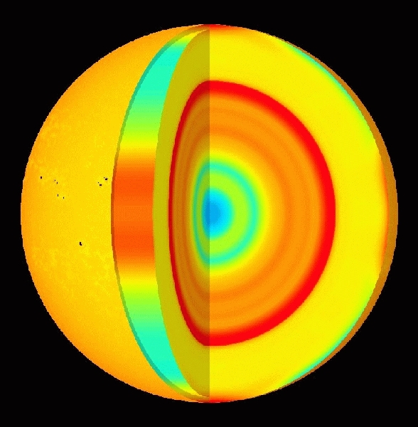 Solar rotation and polar flows of the Sun as deduced from measurements by MDI. The cutaway reveals rotation speed inside the Sun. The left side of the image represents the difference in rotation speed between various areas on the Sun. Red-yellow is faster than average and blue is slower than average. The light orange bands are zones that are moving slightly faster than their surroundings. The new SOHO observations indicate that these extend down approximately 20,000 km into the Sun. Sunspots, caused by disturbances in the solar magnetic field, tend to form at the edge of these bands.