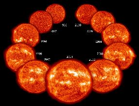 An EIT image in the 304 Angstrom wavelength of extreme UV light from each year of nearly an entire solar cycle.