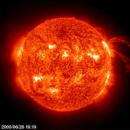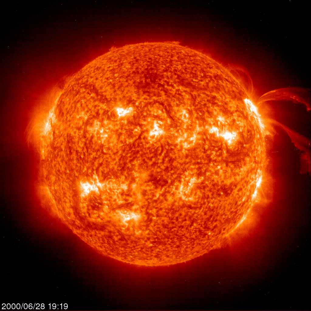 An EIT 304Å image captures a pair of curving erupting prominences on 28 June 2000 -- Prominences are huge clouds of relatively cool dense plasma suspended in the Sun's hot, thin corona. At times, they can erupt, escaping the Sun's atmosphere. Emission in this spectral line shows the upper chromosphere at a temperature of about 60,000 degrees K. Every feature in the image traces magnetic field structure. The hottest areas appear almost white, while the darker red areas indicate cooler temperatures.
