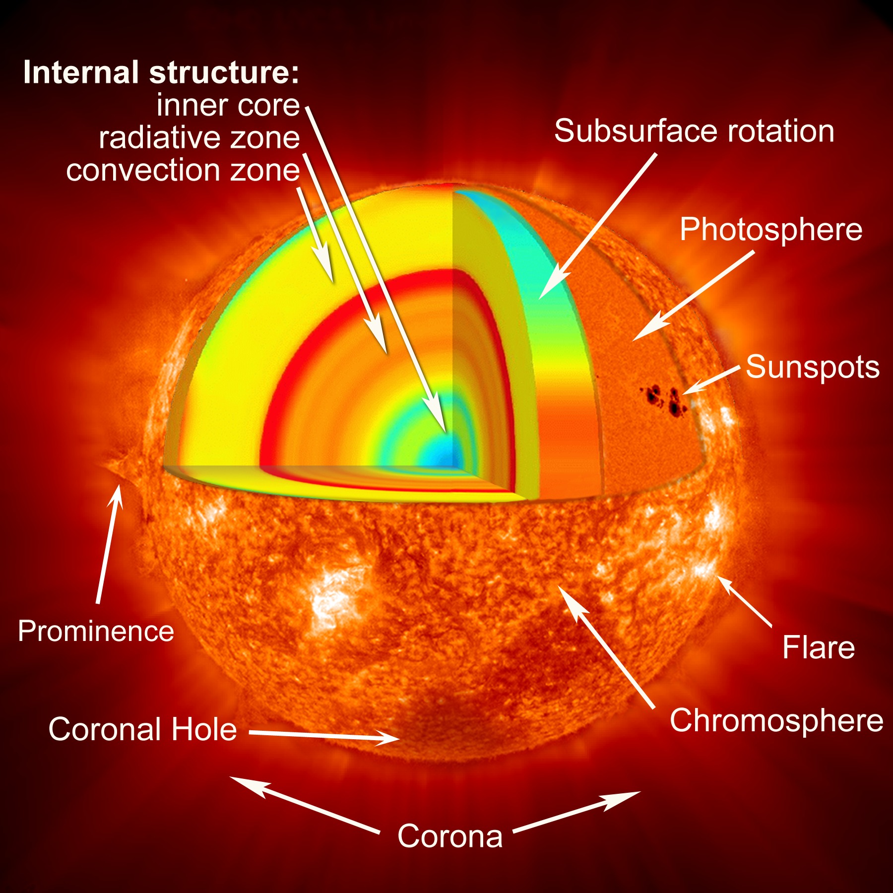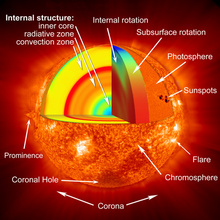 The conspicuous red layer, about a third of the way down from the surface to the Sun's centre, shows unexpectedly high temperatures at the transition between the turbulent outer region (convection zone) and the more stable region inside it (radiative zone). The very core of the Sun (blue) may be 0.1% cooler than the expected 15 million C. Right interior cutaway: Solar interior rotation (red: faster rotation, blue: slower rotation). The equatorial regions rotate faster than the polar regions, all the way down to the bottom of the convection zone. The radiative zone below appears to rotate at the same angular velocity (solid body rotation).