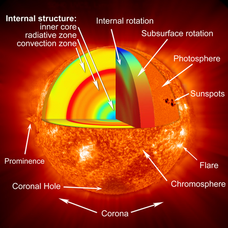 Composite image of the Sun illustrating part of the wide range of SOHO's scientific research. Left interior cutaway: Variations in the speed of sound in the deep interior as gauged by helioseismic measurements by SOHO/MDI and SOHO/VIRGO.