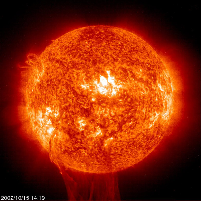 A long solar filament erupted and rushed away from the Sun (Oct. 15, 2002). The image, taken in extreme UV light, shows the eruption in the middle of the action. Filaments are cooler clouds of gas suspended above the Sun's surface by strong magnetic forces. Some unknown cause triggers these eruptions. The prior image, taken by the same instrument six hours before this one, shows that the filament extended more than half way across the Sun, making this one of the largest filaments that SOHO has seen.
