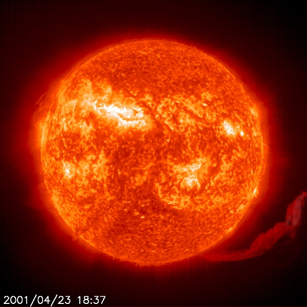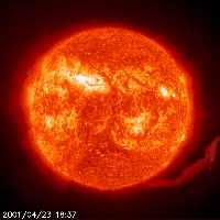 EIT 304Å image captures an elongated erupting prominence -- Prominences are huge clouds of relatively cool dense plasma suspended in the Sun's hot, thin corona. At times, they can erupt, escaping the Sun's atmosphere. Emission in this spectral line shows the upper chromosphere at a temperature of about 60,000 degrees K. The hottest areas appear almost white, while the darker red areas indicate cooler temperatures. Image taken 23 April 2001.