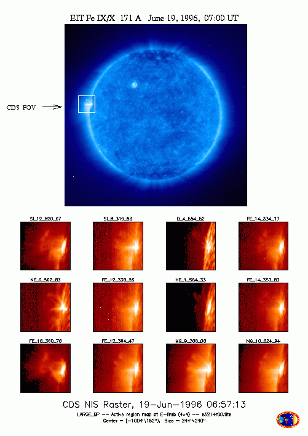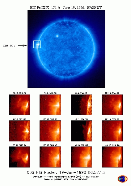 Coronal Diagnostic Spectrometer (CDS) images of active region loops of elements at different temperatures and wavelengths. The small square on the nearly simultaneous EIT image of the Sun indicates the field of view of CDS.