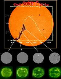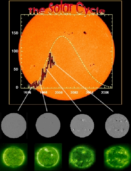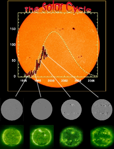 The sun’s 11 year solar cycle as reflected by the number of sunspots recorded to date and as projected (dotted line). Selected EIT 195Å and MDI magnetogram images are shown. In this cycle the Sun undergoes a period of activity called the "solar maximum", followed by a period of quiet called the "solar minimum." The rising level can be clearly seen in the comparison of EIT and MDI images. The current cycle, Cycle 23, is the 23rd systematically recorded since sunspot observations began in the 17th century.