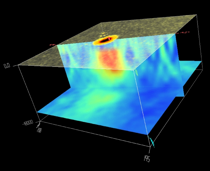 The subsurface structure (sound speed) below a sunspot as derived from Doppler measurements by MDI. Using the technique of time-distance helioseismology, three planes are shown. The surface intensity shows the sunspot with the dark central umbra surrounded by the somewhat brighter, filamentary penumbra. The second plane cuts from the surface to 24000 km deep showing areas of faster sound speed as reddish colors and slower sound speed as bluish colors. The third plane (bottom) is a horizontal cut at a depth of 22000 km showing the horizontal variation of sound speed.
