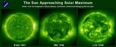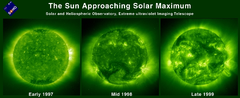A comparison of three EIT images almost three years apart illustrates how the level of solar activity has increased significantly. The Sun attains its expected sunspot maximum of its 11-years solar cycle in the year 2000. These images are captured using Fe XII 195 Å emissions showing the solar corona at a temperature of about 1 million K. Many more sunspots, solar flares, and coronal mass ejections occur during the solar maximum. The progression towards more active regions and the number/size of magnetic loops is unmistakable.