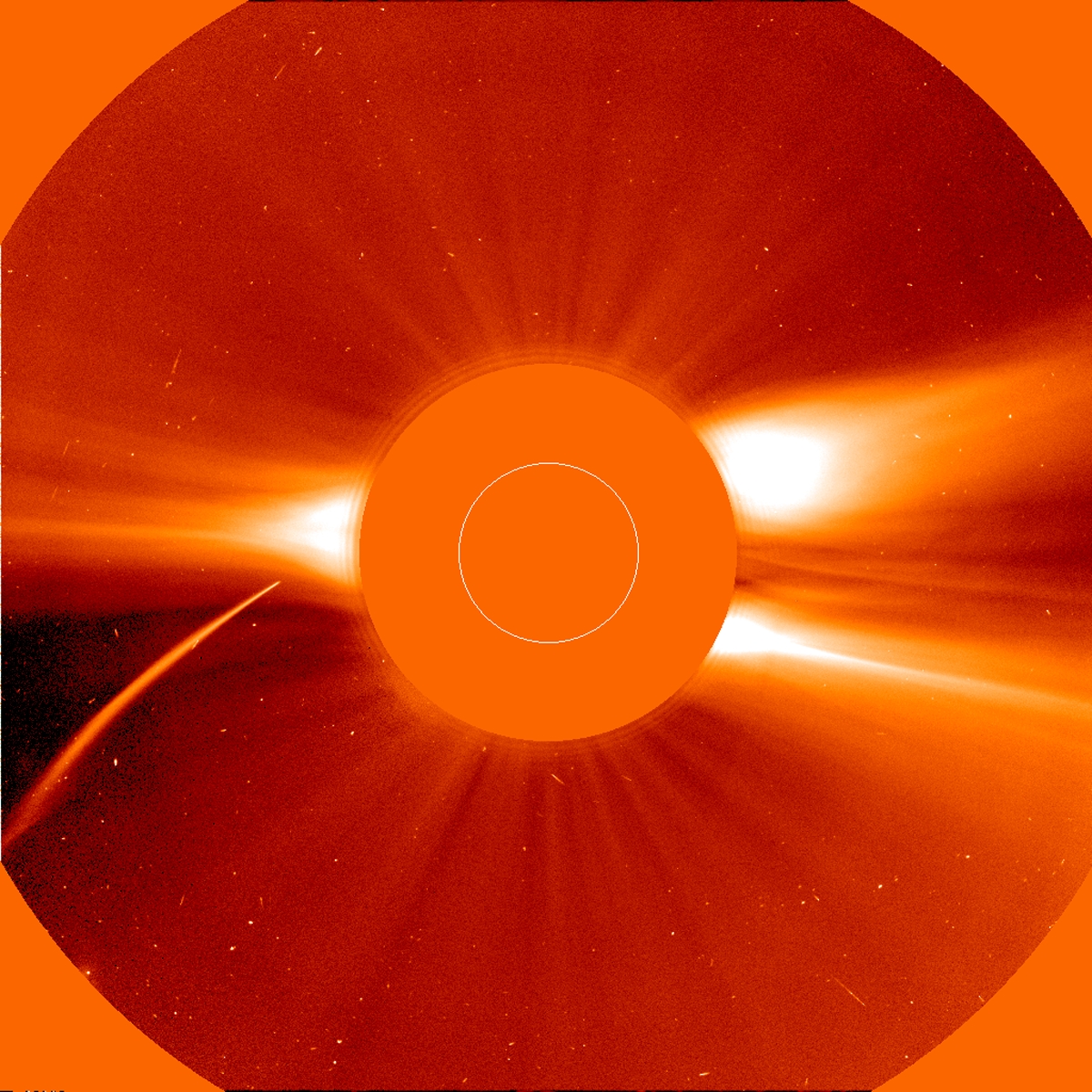 The LASCO C2 frame was selected to show Comet SOHO-6, one of numerous sungrazing comets discovered by LASCO, as its head enters the equatorial solar wind region. It eventually plunged into the Sun. This image of the solar corona on 23 December 1996 also shows the inner streamer belt along the Sun's equator, where the low latitude solar wind originates and is accelerated. Over the polar regions, one sees the polar plumes all the way out to the edge of the field of view. The field of view of this coronagraph encompasses 8.4 million kilometers (5.25 million miles) of the inner heliosphere.