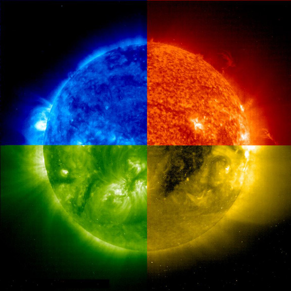An "EIT colour wheel", showing images in the four filters of EIT. Clockwise from upper left: 171 Å, 304 Å, 284 Å, 195 Å.