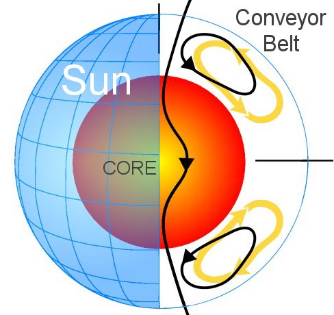 Artist's concept of the Sun's meridional circulation, a large scale flow that transports solar plasma from the equator to the poles and back like a giant conveyor belt. Credit: Science@NASA. |