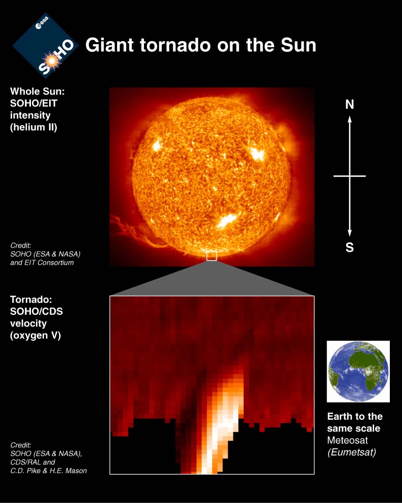 - 9815: Surprises from SOHO include tornadoes on the Sun. Related Images: Giant Tornado on the Sun ( JPG file, size: 85K)-caption; Inside the Sun: Unexpected Temperatures ( JPG file, size: 70K)-caption; The Breeze from the Satrs ( JPG file, size: 87K)-caption