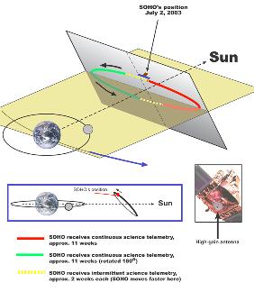 be able to transmit any data back to Earth. However, SOHO engineers found that medium-rate transmissions can be sent through its two omni-directional, low gain antennas when larger NASA Deep Space Network receiving stations are available. On the largest stations, with 70 meter dishes, even high-rate transmissions are possible. Medium-rate transmissions contain real-time science data, but does not have the capacity to dump on-board recordings of earlier gaps in contact. Given this newfound capability, SOHO expects to experience only moderate data losses every day during the recurring 2-3 week periods. Full transmission is expected to return about July 14 until the next orbital problem period, expected to start on September 22. Scientists are quite relieved as SOHO is the only spacecraft that can effectively monitor certain solar storms, which can generate effects felt on Earth. Please visit our Newsroom for press releases and media coverage.
