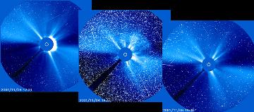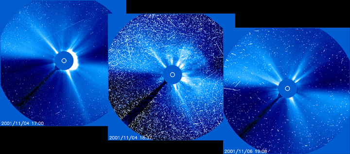 | An X-class (scientific term for very strong) solar flare (not pictured) and a coronal mass ejection (CME) blasted off of the sun, on November 4, 2001, rocketing high-energy protons into the SOHO imager within minutes of the storm's onset. The first two images LASCO C3 instrument show the expanding CME and the particles appearing as white specks. The third image shows the storm just beginning to ease up over two days later. A comparison of the three largest particle events observed by the SOHO/CELIAS instrument shows that in terms of particles above 50 MeV, this one was the largest by half an order of magnitude. This storm caused brilliant aurora to appear over much of the Earth on Nov. 5 and 6 and was the most intense proton storm of the current solar cycle. The Sun, blocked by an occulting disk, is represented by the white circle. The breadth of view of the C3 instrument is 30 solar radii. |