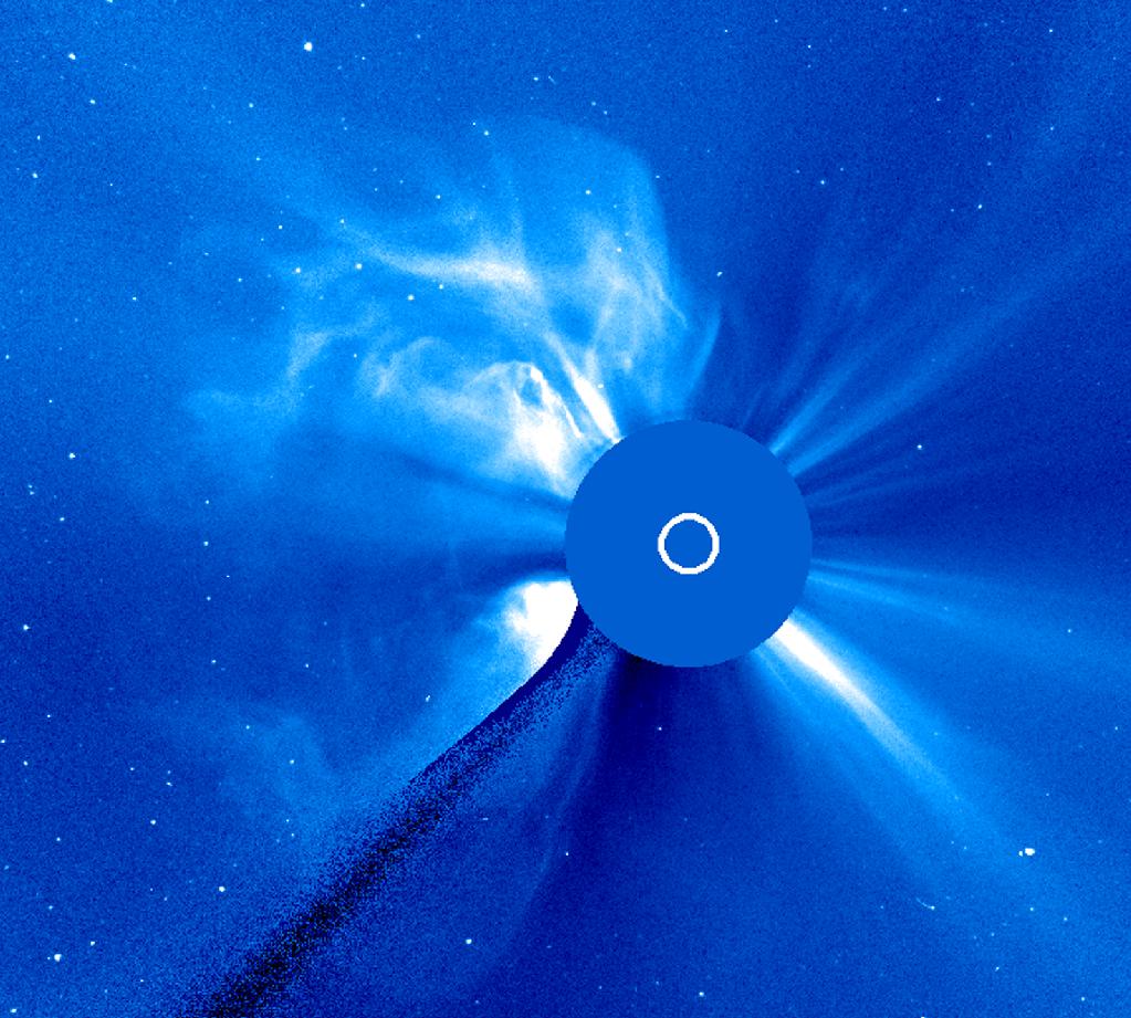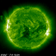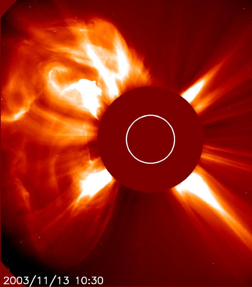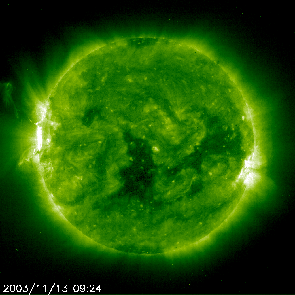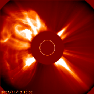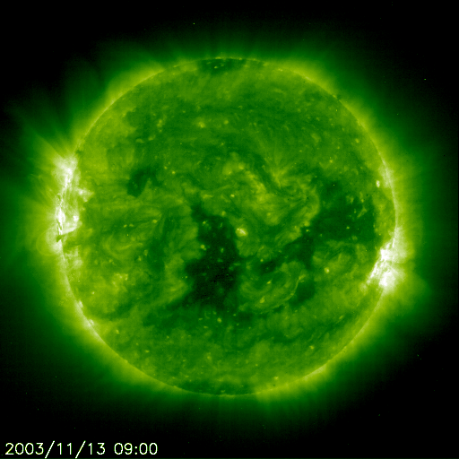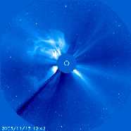 solar activity two weeks ago is announcing its return. A large coronal mass explosion (CME) blasted out on 13 November 2003, probably from the old active region 484, which is now about to rotate back into view. When last here, this area and its pal produced a significant number of flares and CMEs, including the largest solar flare ever recorded. And many blasts have been noted as originating on the backside of the Sun while AR 484 and 486 were rotating there. Views of the Sun in extreme ultraviolet light show that a large active region is rotating into view right at the Sun's left edge. The second active region should follow its pal in a few more days. Space weather could get very interesting once again.