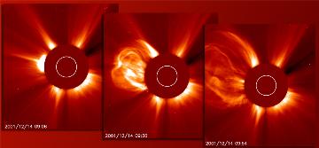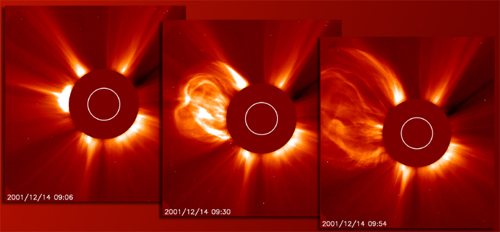 | These three images taken in less than an hour by the LASCO C2 instrument on Dec. 14, 2001 show a very rapidly expanding coronal mass ejection (CME) blasting billions of tons of particles out from the Sun at about four million kilometers per hour. The Sun, blocked by an occulting disk, is represented by the white circle. The breadth of view of the instrument is twelve solar radii or about 8.6 million kilometers. This event did not seem to be directed towards Earth. |