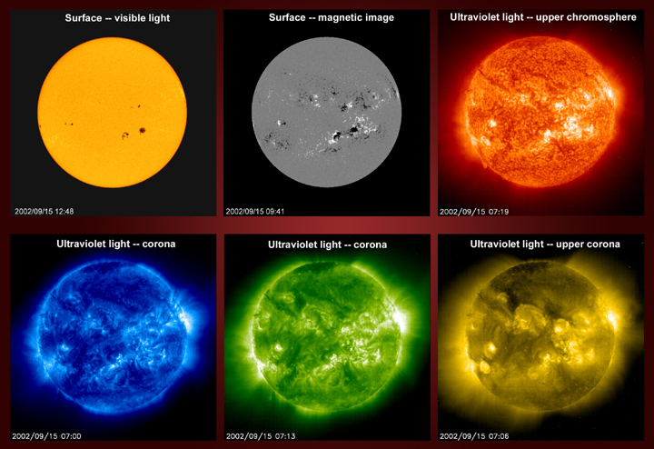 Each of the images from SOHO reveals different features of the Sun