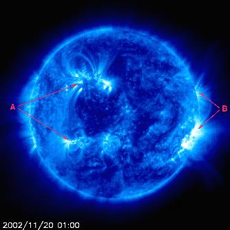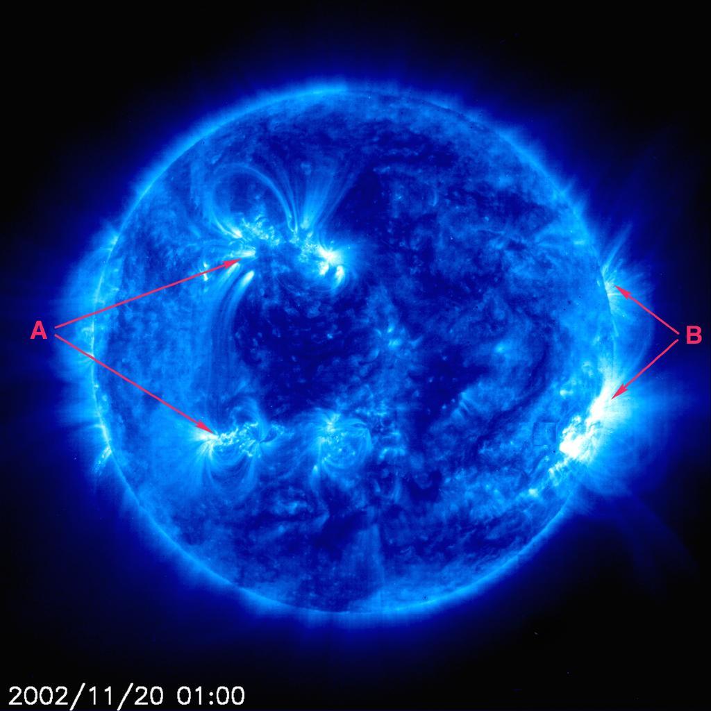 to the active region at the higher of the two "A" arrows. In a low-density but highly ionized gas (or "plasma") such as the Sun's outer atmosphere, the magnetic field rules: charged particles must spiral around closely aligned, loop-like magnetic fields. The closed magnetic loops originate in bright "active regions" in this image of 1 million K material in the lower corona. The blue Sun (171Å) images ionized iron at 1 million degrees C.