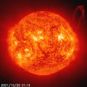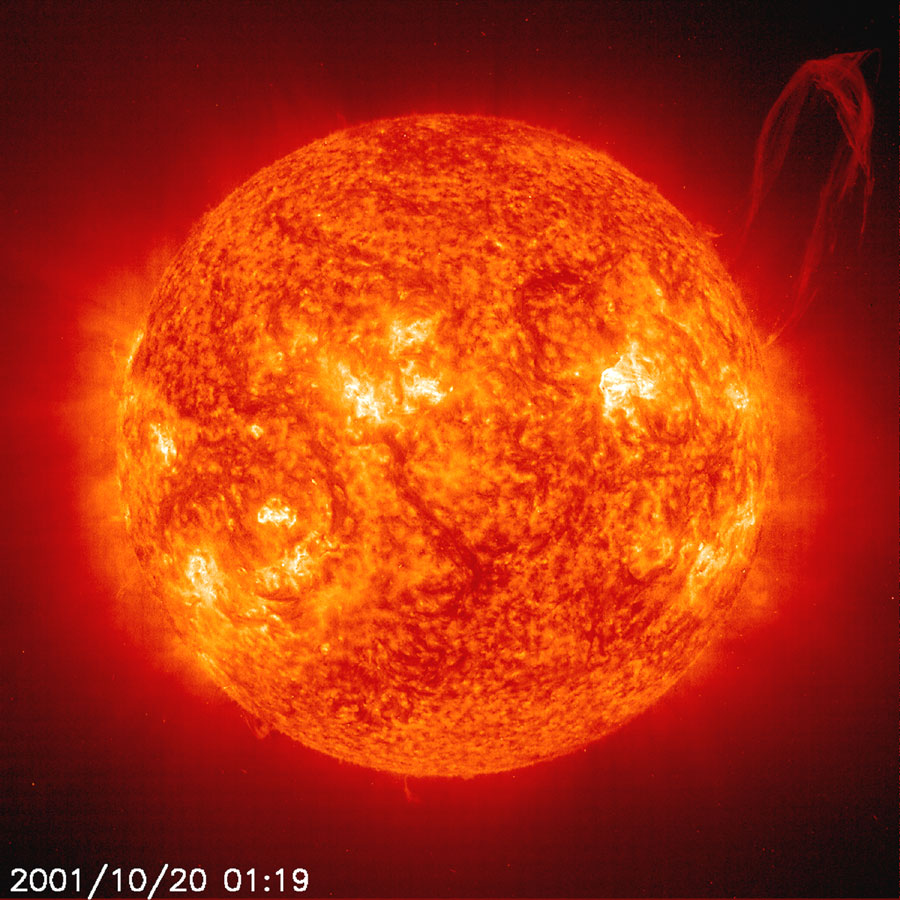 | A solar prominence in extreme ultraviolet light (He II at 304Å) breaks away from the Sun. Prominences are huge clouds of relatively cool, dense plasma suspended in the Sun's hot, thin corona. Magnetic fields built up enormous forces that propelled particles out beyond the Sun's surface. Emission in this spectral line shows the upper chromosphere at a temperature of about 60,000 degrees K. To give a sense of scale, the prominence extends about 30 Earths out from the Sun. |