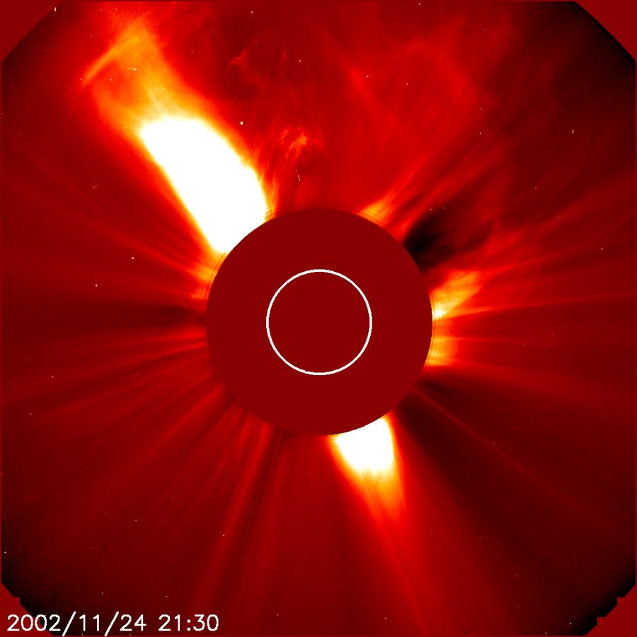 clear, though neither CME appears likely to impact the Earth. CMEs eject a billion tons of particles traveling one to two millions of miles an hour. The dark disk blocks the Sun so that the LASCO instrument can observe the structures of the corona in visible light - structures a billion times fainter than the disk of the Sun.