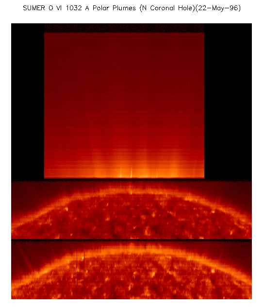 Fig.2 (~0.1Mb): The first part of the sequence used the 0.3 x 120 arcsecond slit to make two raster images or spectroheliograms (16 x 2 arcminČ) with 1.5 arcsecond steps extending ± 8 arcminutes from central meridian, shown in the bottom half of the figure. (The scale is 1.5 arcsec/pixel along the x-axis and 1 arcsec/pixel along the y- axis) In these raster images, one can see narrow jets or macrospicules originating from bright points near the limb and extending 30-60 arcseconds above the limb on both the east and west side of central meridian. The second part of the sequence, using the 1 x 300 arcsecond slit, extending from 30 arcseconds above the limb out to 1.33 solar radii, obtained a single raster image or spectroheliogram extending ± 5 arcminutes from central meridian, shown in the top half of the figure. One can see in this image, along with the larger scale plume structures, two small jets or macrospicules near central meridian which appear to originate from bright points at the limb in the lower images and extend 15-20 arcseconds into this upper image.