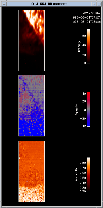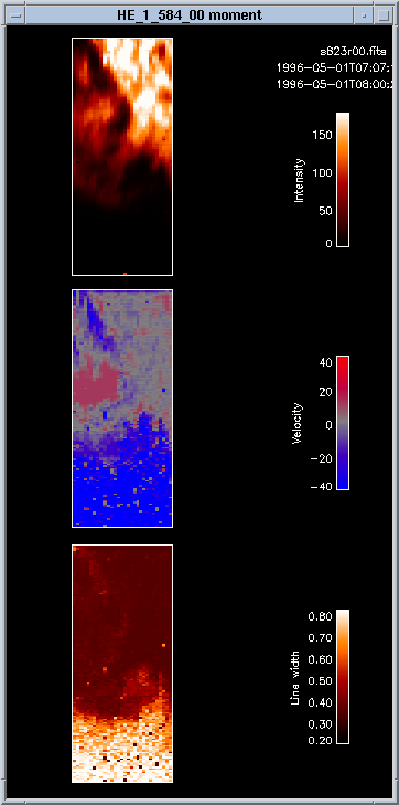 Fig.9a (~0.03Mb), Fig.9b (~0.03Mb): CDS observations between 07:07 and 07:58 UT for He I (a) and O IV (b) lines. Top panels, intensity; middle panels, Dopplerhift; low panels, line width. The redshifted part corresponds to the SUMER bubble A, the blueshifted one to the SUMER structure B.
