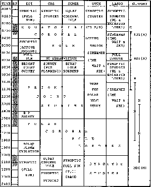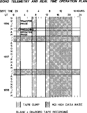 Fig 2.2 shows the proposed overall time line of operations. The time of the long real-time operation (MDI high data rate) has been chosen to be day-light in GSFC and to overlap about half time with the Canary Islands observatories and with the USA western observatories. The 2-month continuous operation is arbitrary selected. It is expected that both the time of the day and the period of the year for the MDI high data rate will have to be adapted to DSN capabilities both for technical and scheduling reasons.