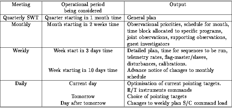 The SWT will set the overall science policy and direction for mission operations, set priorities, resolve conflicts and disputes, and consider Guest Investigator observing proposals. During SOHO science operations, the SWT will meet every three months to consider the quarter starting in one month's time and form a general scientific plan. If any non-standard DSN contacts are required, the requests must be formulated at this quarterly meeting. The three-month plan will then be refined during the monthly planning meetings (see 2.1.2) of the Science Operations Team (SOT), composed of those PIs or their team members with IWSs at the EOF, which will allocate observing sessions to specific programs. At weekly meetings of the SOT (2.1.3) , coordinated timelines will be produced for the instruments, together with detailed plans for spacecraft operations. Daily meetings of the SOT (2.1.4) will optimize fine pointing targets in response to solar conditions and adjust operations if DSN anomalies occur.